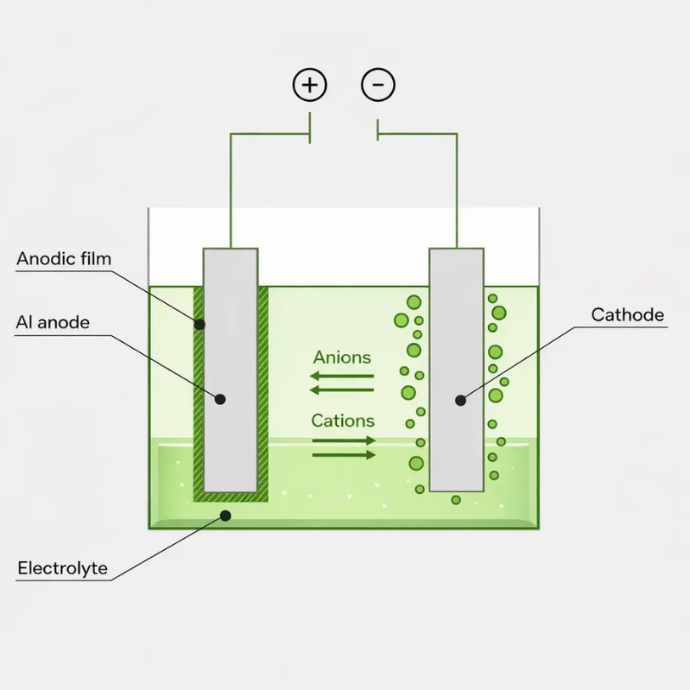 An electrical current is introduced, prompting the aluminum surface to react and generate a uniform oxide layer.